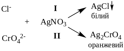 2. Використання речовин, які утворюють з титрантом забарвлені сполуки, менш міцні, ніж основний продукт. Наприклад, для визначення хлоридів аргентометричним методом до розчину, що аналізується, додають розведений розчин калій хромату. При титруванні суміші калій хлориду та калій хромату першою утворюється менш розчинна сполука арґентум хлориду. Після зв'язування хлорид-іонів (СCl– =10-5 моль/л) титрант реагує з хроматом. Поява осаду помаранчевого відтінку внаслідок утворення Ag2Cr04 відповідає моменту еквівалентності (метод Мора).