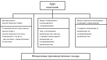 ОПП по месту его выполнения подразделяется на межцеховое и внутрицеховое. Межцеховое осуществляется ПДО – производственно-диспетчерским отделом предприятия (рисунок 20). В функции его входят разработка оперативно-календарных нормативов, взаимная увязка содержания и сроков календарных графиков работы цехов, составление и выдача цехам календарных планов по месяцам, оперативный учет и диспетчирование выполнения календарного плана.