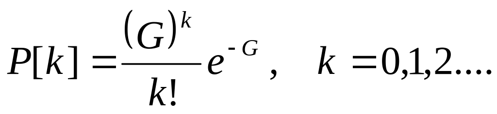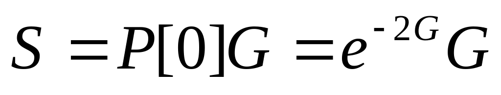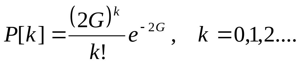 В общем случае, взаимосвязь величин S и G установить трудно. Вместе с тем, есть достаточно оснований считать, что поток кадров, поступающих в MAC-модули сетевых узлов, является пуассоновским случайным процессом. Допустим также, что и поток повторно передаваемых кадров является пуассоновским. Вообще говоря, это не так, поскольку повторные передачи являются зависимыми случайными событиями. Тем не менее, достаточно строгое рассмотрение показало, что допущение о пуассоновском характере потока вторичных передач справедливо при умеренной их интенсивности. Примем это допущение, и будем считать полный поток кадров, поступающих в среду передачи пуассоновским со средним значением интенсивности G/X. Тогда, среднее число кадров, поступающих в канал за время уязвимости (2X секунд) составит 2G, а вероятность поступления в канал за это же время k кадров будет равной