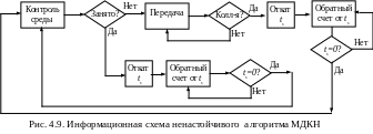 Ненастойчивый алгоритм МДКН (рис. 4.9) старается уменьшить вероятность возникновения коллизии. Если станция обнаружила занятость канала, она сразу выполняет откат и вычисляет время задержки до начала следующей попытки прослушивания среды (ts). Благодаря немедленному выполнению отката и псевдослучайному характеру выбора значения ts, риск возникновения коллизии уменьшается. В сравнении с настойчивым алгоритмом МДКН, производительность МАС-протокола при высоких нагрузках повышается, но среднее время задержки передачи (td) в условиях низких нагрузок оказывается большим.