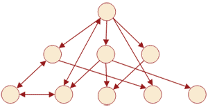 Сетевую структуру также можно описать с помощью исходных и порожденных элементов: каждый элемент может иметь как несколько порожденных, так и несколько исходных элементов. В ней порожденные элементы располагаются ниже исходных. В простых сетевых структурах между парой элементов поддерживается отношение «один – ко – многим». Направление и характер связи между элементами не является очевидным, и поэтому направление связи должно быть указано.