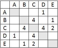 12. Между населёнными пунктами A, B, C, D, E построены дороги, протяжённость которых приведена в таблице. (Отсутствие числа в таблице означает, что прямой дороги между пунктами нет). Определите длину кратчайшего маршрута из А в B. |
