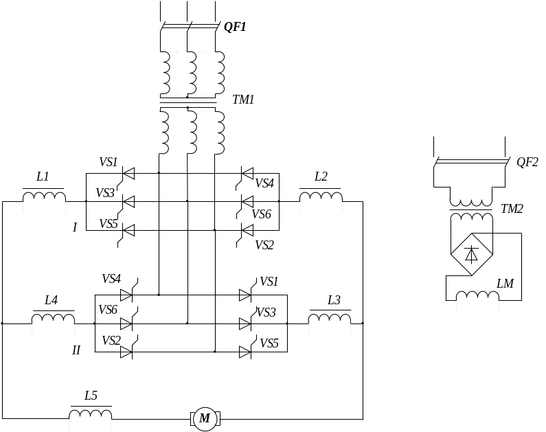 Схема силовой части тиристорного преобразователя представлена на рис. 1.4 и содержит силовой трансформатор ТМ1, трёхфазный выпрямитель, выполненный по симметричной мостовой схеме, уравнительные L1 – L4 и сглаживающий дроссель L5. Каждый мост состоит из шести тиристоров (VS1 – VS6). Реверс выходного напряжения осуществляется переключением силовых мостов.