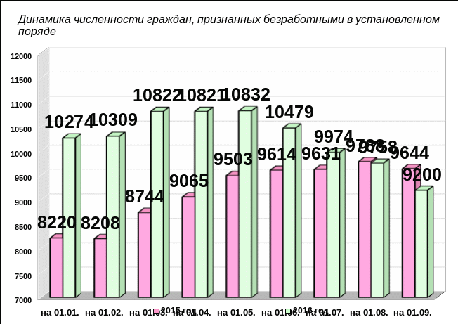 В целом по области в органах службы занятости на 01.09.2016 года зарегистрировано 9200 безработных, что на 444 человека или на 4,6 % меньше по сравнению с соответствующим периодом прошлого года, и на 1074 человека или на 10,5 % меньше по сравнению с началом года.