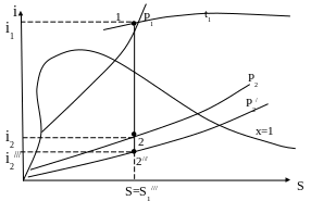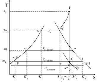 У діаграмі водяної пари процес розширення пари в турбіні із проміжним перегрівом зображується таким чином (Рис.12. а, в, с). На перетині ізобари і початкової температури пари при вході в турбіну знаходимо точку 1. Точка 1 – початковий стан пари при вході в турбіну. Потім із точки 1 опускаємо перпендикуляр до перетинання з ізобарою (тиск, при якому пара перегрівається у другому пароперегрівнику). Одержуємо точку "а". Точка "а" може перебувати в області вологої пари (мал. 12 а), на лінії сухої насиченої пари (Рис. 12 б) і в області перегрітої пари (мал. 12 c).