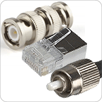Разъемы, находящиеся на концах патч-корда, называются коннекторами. Коннектор RJ 45, стандарт витой пары (UTP), обжимается согласно цветовой схеме (иногда она называется «распиновкой»). Для его подключения в основном используется прямая, реже – обратная схема обжима. К стандартным оптическим коннекторам относят следующие типы: ST, SC, LC, FC и FDDI. Они монтируются на концы оптического кабеля методом химической сварки, либо механической фиксации. Для подключения тонкого коаксиального кабеля используются в основном ВNС-коннекторы. Они либо припаиваются, либо обжимаются на конце кабеля. Основные разновидности коаксиальных коннекторов: Т-образный, соединяющий сетевой кабель с сетевой платой; баррел-коннектор применяющийся для сращивания двух отрезков кабеля; и терминатор (заглушка), устанавливающаяся на концах кабеля.