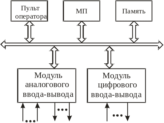 Измерительные контроллеры преобразуют и выдают в микроЭВМ в цифровом коде показания датчиков о состоянии объекта и среды. В частном случае в качестве этих устройств используются непосредственно аналого-цифровые преобразователи (АЦП). В состав интерфейсных модулей связи и контроллеров могут входить и микропроцессоры. В этом случае центральный процессор освобождается от трудоемких функций по предварительной обработке вводимой и выводимой информации.