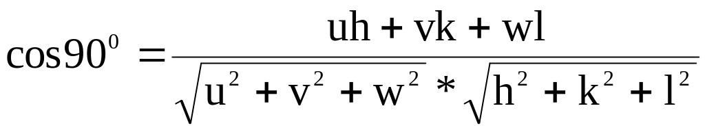 1.1.7 Тiкбұрышты координат жүйесiндегi жазықтық пен түзу арасындағы бұрыш. (hkl) жазықтығы және [uvw] нормалi арасындағы бұрыш 900-қа тең cos900=0 (1.2) формуланы былай жазуға болады: