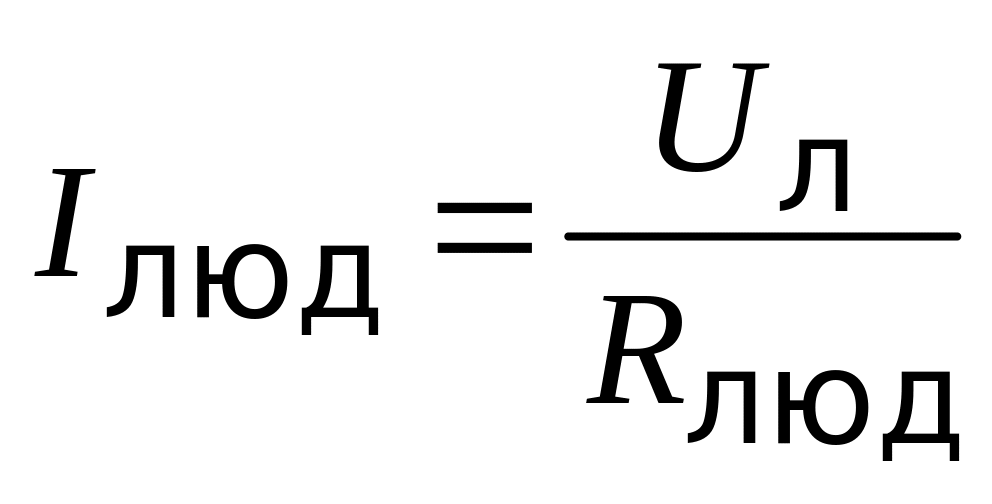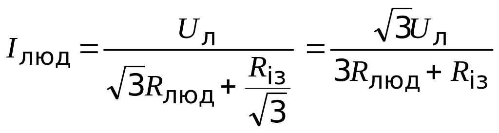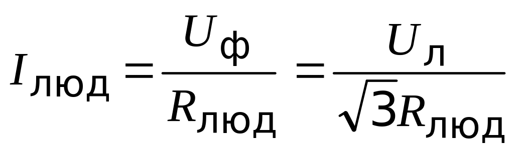 де Uл і Uф - лінійна и фазова напруга мережі; Rлюд - опір ділянки тіла людини, між точками якого прикладена лінійна напруга Uл.