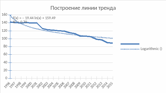 По данным таблицы построим график значений и добавим линию тренда с помощью программного продукта Microsoft Excel в виде линейной, логарифмической, степенной, экспоненциальной и полиномиальной функций. Для примера рассмотрим построение логарифмической линии тренда (рис.1.1). Результаты и полученные данные объединим в таблицу для выбора наиболее предпочтительной модели (таблица 1.2).