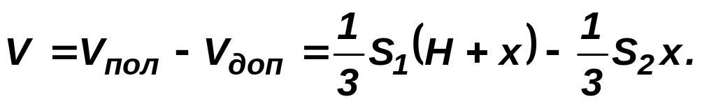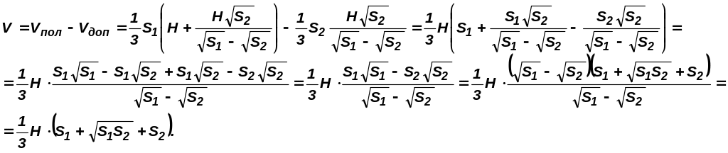 Дополним усеченную пирамиду до полной. Тогда объем усеченной пирамиды равен разности объемов полной и дополнительной пирамид.