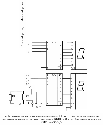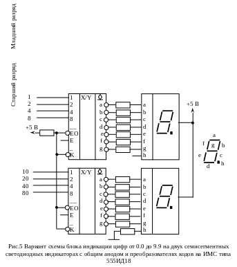 При малом числе индицируемых разрядов (до четырех) используется статические схемы преобразования. В этом случае каждый отдельный индикатор подключается к семисегментному преобразователю, поэтому число преобразователей двоично-десятичного кода в семисегментный код равно числу используемых индикаторов. На рис.5 показан пример схемотехнического решения при подключении двухразрядных семисегментных светодиодных индикаторов по статической схеме с использованием индикаторов с общим анодом и преобразователей кода типа 555ИД18.