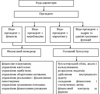 На рис.2.1 зображений розподіл функцій фінансового менеджменту у корпорації. Посада віце-президента з фінансів існує тільки у великих компаніях, у середніх - фінансовий менеджер і головний бухгалтер, а в малих - тільки головний бухгалтер.