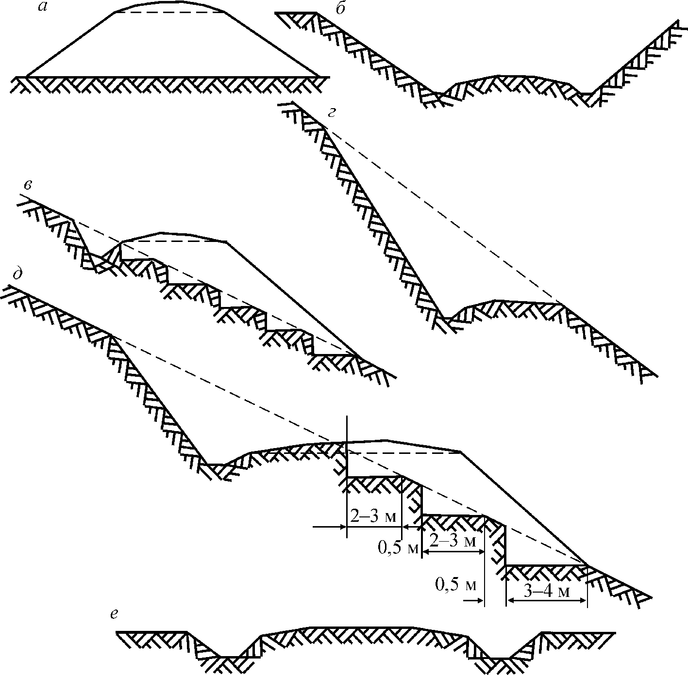 насыпь [а], выемка [б], полунасыпь [в], полувыемка [г], полунасыпь-полувыемка [д], нулевое место [е]