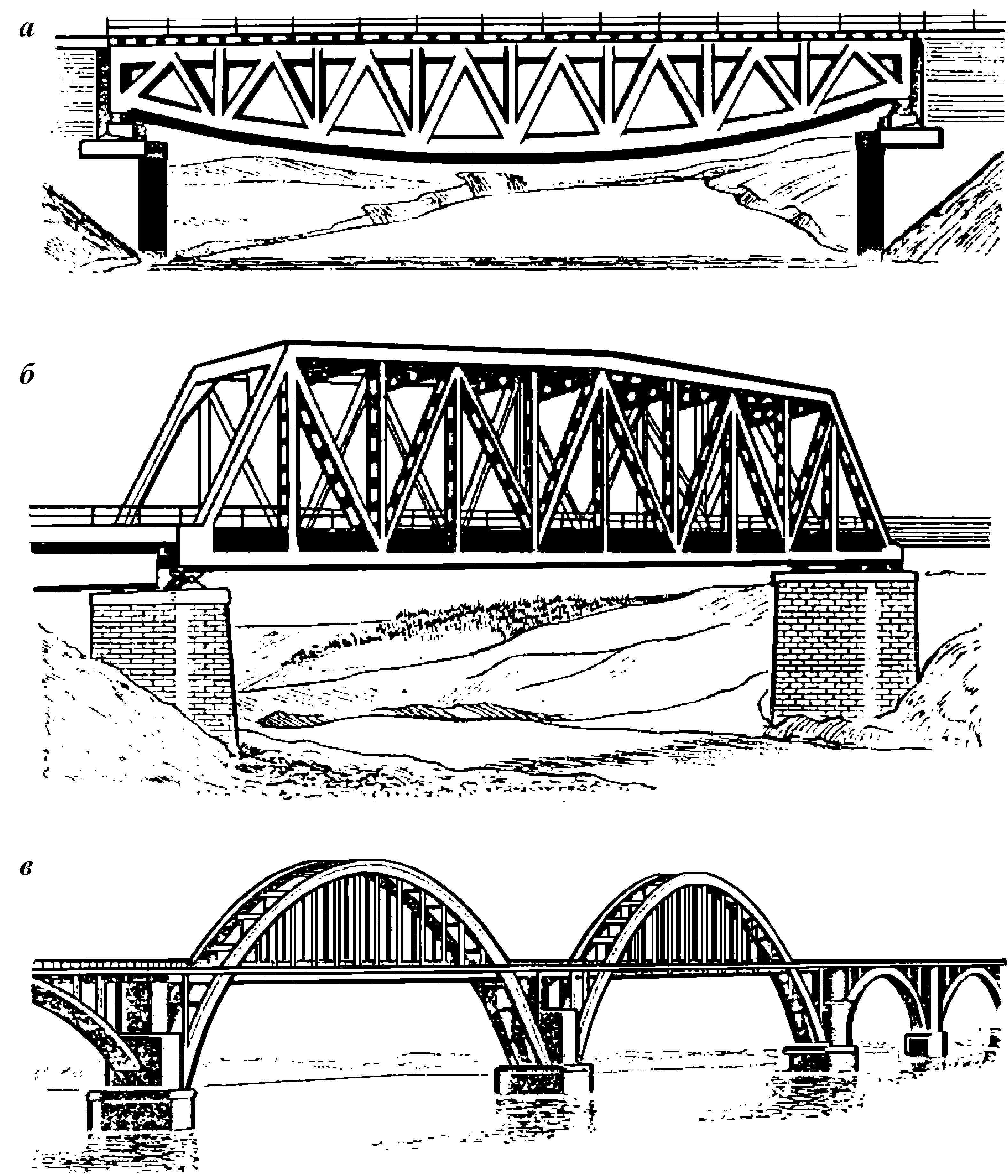 Мосты бывают металлические, железобетонные, бетонные, каменные и деревянные. Мост состоит из опор и пролетных строений. На судоходных реках для пропуска судов строят разводные или подъемные мосты.