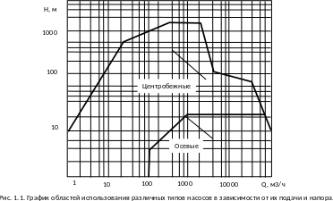 Области применения различных типов насосов в зависимости от их подачи и напора приведены на рис. 1.1 [1].