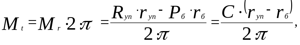 де Мr - радіальний момент; Rуп=-С і Рб=С - реакція упору і сумарна сила затягування болтів, що за величиною рівні відцентровій силі системи лопаті; rуп - середній радіус упорної площадки буртика; rб - радіус сил окружності розташування болтів.