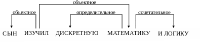 Рассмотрим расположение графа в предложениях с подчиненной и сочиненной связью. Изображение всех связей однородных членов между собой, с подчиняющими и подчиненными элементами приводит к возникновению замкнутых контуров в графах зависимостей. Чтобы избежать этого, часто используют представление, при котором сочинительная связь включается в граф зависимостей наравне с другими синтаксическими отношениями, а подчинительные связи, общие для группы однородных членов, изображаются лишь для одного члена группы (рис.9.3).