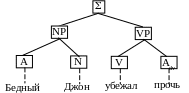 Представление синтаксической структуры в терминах дерева составляющих хорошо согласуется с традиционным «разбором» предложения, при котором подлежащее, сказуемое и их элементы описываются категориальными характеристиками – именами частей речи или групп. Например, фраза Бедный Джон убежал прочь будет представлена так , как показано на рисунке 9.5.