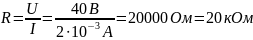 Рассмотрим пример. Напряжение 40 В измерено вольтметром с односторонней шкалой; номинальное значение прибора — 50 В, 6-й класс точности (1,0%). Сила тока 2 мА измерена амперметром с односторонней шкалой; номинальным значением прибора —3 мА, 6-й класс точности (1,0%). Определить значение измеренного сопротивления резистора, а также относительную и абсолютную погрешности измерения сопротивления резистора.