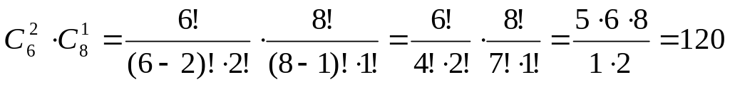 Число исходов, благоприятствующих событию В – число способов выбора из имеющихся 6 синих шаров двух шаров и из 8 белых шаров одного шара, равно