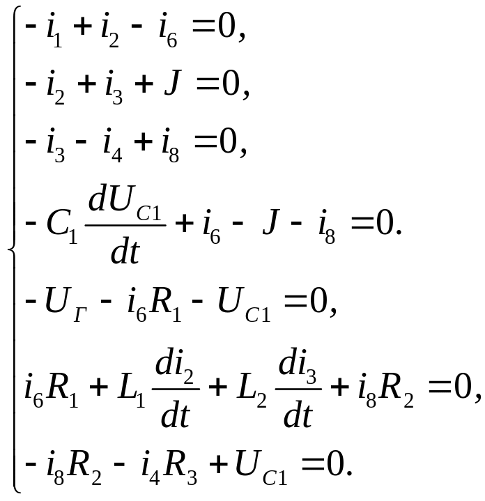 Отже, маємо сім невідомих величин (i1, i2, i3, i4, i6, i8, UC1) і сім рівнянь.