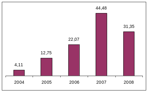 На рис.5.6 представлена інформація про обсяги випусків облігацій підприємств України. Так, тільки протягом 2008 року Державною комісією з цінних паперів та фондового ринку зареєстровано 912 випусків облігацій підприємств на суму 31,35 млрд грн. Порівняно з 2007 роком обсяг зареєстрованих випусків облігацій підприємств зменшився на 13,13 млрд грн., що є результатом фінансової кризи. Хоча загальна тенденція свідчить про невпинний ріст цього показника як джерела залучення коштів на фондовому ринку.
