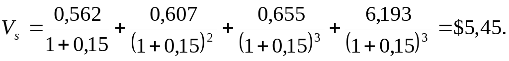 Приклад. Підприємство виплатило по дивідендах $0,52 за останній рік. Протягом найближчих трьох років темп росту дивідендів складе 8%. У майбутньому (без обмежень за часом) дивіденди будуть рости з темпом 4%. Оцінити ринкову вартість цієї акції, якщо її прибутковість оцінена на рівні 15%.