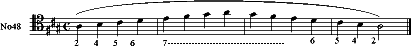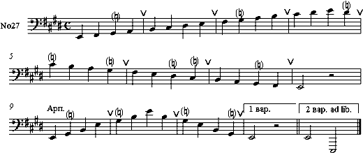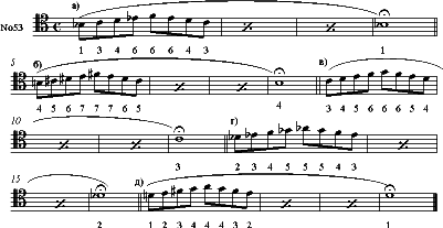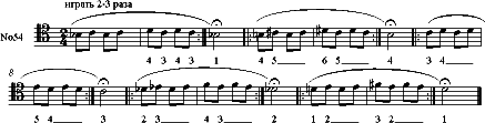 Играть эти и подобные гаммы несложно. Труднее на добавочных позициях подстраиваться к звукоряду этих гамм, поэтому гораздо интереснее, да и полезнее, уделить больше внимания натуральному легато в небольших упражнениях с использованием добавочных позиций.