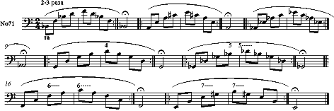 Этот элемент игры тоже требует специальных упражнений. Проще и легче всего начать упражняться в среднем регистре и умеренном темпе. Здесь также все внимание следует обратить на губную артикуляцию и подачу дыхания при переходах от звука к звуку.