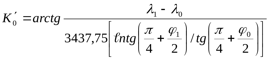 При 0 = φ1 расчет по формуле (2.30) приводит к неопределенности, т.к. аргумент арктангенса стремится к бесконечности. В таких случаях локсодромический курс с точностью до 0,50 принимается равным 900 при движении судна на восток (1 > 0) и = 2700 при движении на запад (1 < 0).