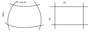 На рис. 3.2 показаны элементарный участок земного сфероида, ограниченный отрезкамимеридианов длиной Mdφ и отрезками параллелей длиной Ncosφdλ, и соответствующий участок карты со сторонами, равными dx и dy.