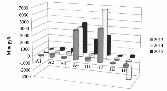 Таблица 5. Группировка активов и пассивов по степени ликвидности средств и срочности погашения обязательств за 2013–2015 гг.