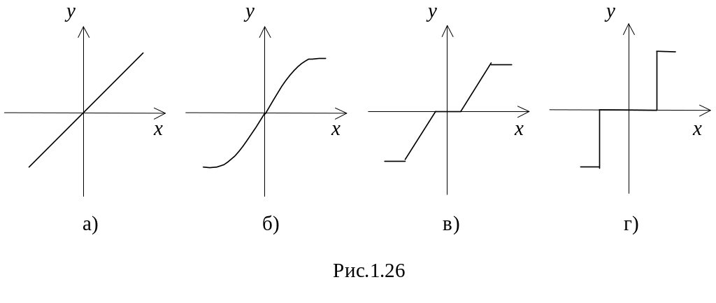 рактеристикою. Статичною характеристикою системи (елемента) називається залежність між вхідною та вихідною величинами. Статичні характеристики елементів, на базі яких одержують статичну характеристику системи, розраховують, або одержують експериментально. Приклади статичних характеристик елементів наведені на рис.1.26.