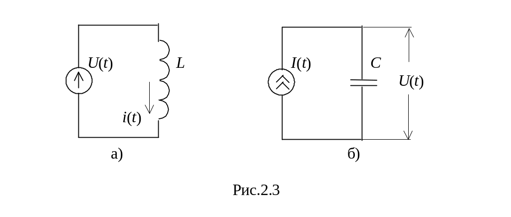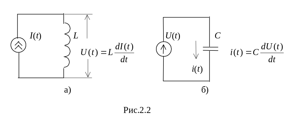 Прикладами диференційних ланок є підключення індуктивності L (рис.2.3,а) до джерела напруги U(t) та підключення конденсатора С (рис.2.3,б) до джерела струму I(t) . Динамічні процеси в ланці рис.2.3,а характеризуються рівнянням