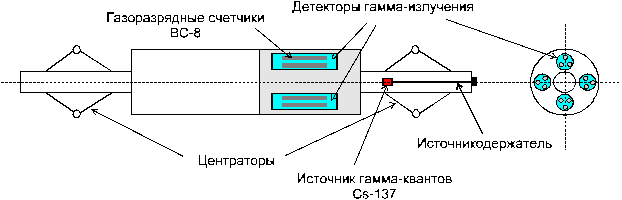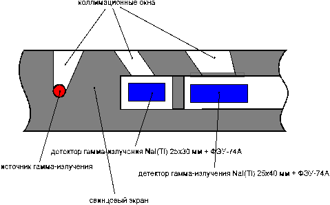 В качестве детекторов используются кристаллы NaI(Tl) размерами 2530 мм в канале малого и 2540 мм в канале большого зондов ГГКп в комплекте с ФЭУ-74А (см рис.). Коллимационные окна заполнены капролоном. Для регулировки спектральной чувствительности измерительной установки в коллиматоре большого зонда установлен экран из свинца.