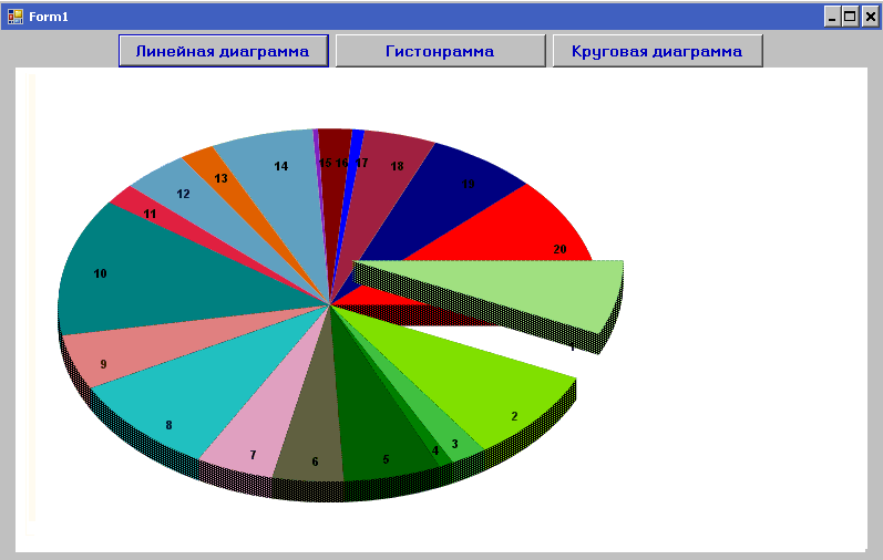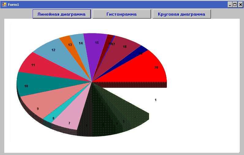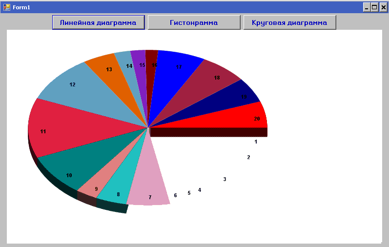 Для построения гистограмм нам потребуется внести в наш класс одну новую функцию и один массив переменных Brush. Можно было воспользоваться классом SolidBrush и по датчику случайных чисел формировать цвета, но все же, более приятно смотреть гистограмму с удачно подобранными соседними цветами (каждый может выполнить подборку цветов на свой вкус).
