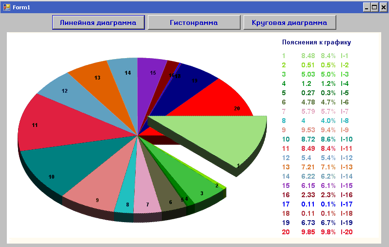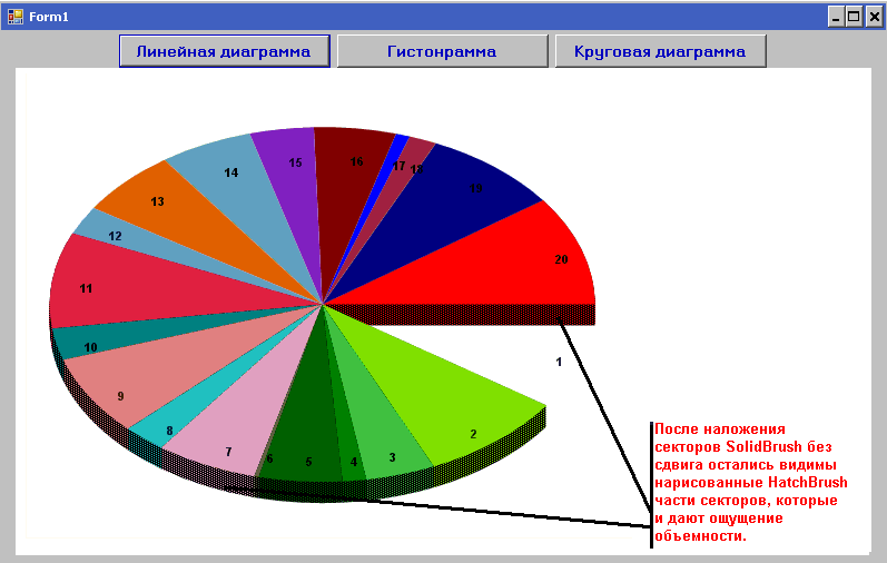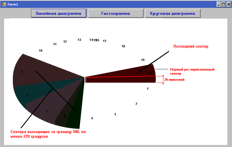 Добавляем функции надписи и легенду и, в принципе, построение диаграммы закончено. Единственное, что потребуется от нас при рисовании надписей на диаграмме - это немного вспомнить начальную школу при расчете координат нанесения значений:
