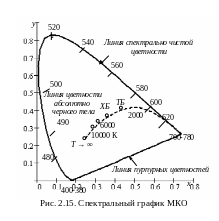 Последняя особенность позволила ввести еще один параметр световых источников: цветовая температура Tц. Под цветовой температурой понимают температуру модели абсолютно черного цвета с цветовыми координатами, наиболее близко соответствующими цветовым координатам данного источника. На рис. 2.15 показан вид зависимости цветовых координат, соответствующих цветовому восприятию человеческого глаза. На этом же графике представлены значения цветовых координат абсолютно черного тела при различной температуре, включая случай Tц→ ∞. В таблице 2.3 представлены координаты и значения цветовой температуры люминесцентных ламп дневного света промышленного выпуска. (Расшифровка условных обозначений типа лампы приводится в разделе 4.8.1, стр. 63.)