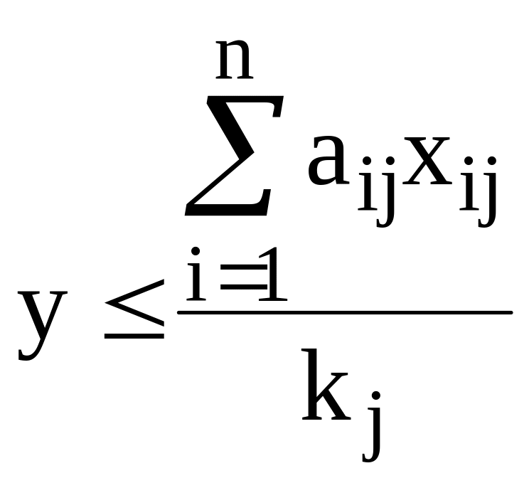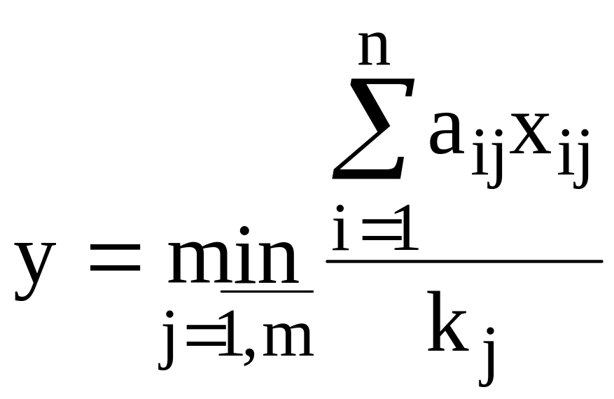 Пусть планируется производство комплектных изделий. Каждое изделие содержит m видов деталей, причем деталей первого вида - k1 единиц, деталей второго вида k2 единиц, деталей j-го вида kj единиц. Изделия могут изготавливаться n различными исполнителями. Пусть в единицу времени i-й исполнитель может изготовить aij элементов j-го вида. Сдаче подлежат только комплектные изделия. Каждый i-й исполнитель работает не более bi часов. Определить такой план загрузки исполнителей, чтобы общее число выпускаемых комплектных изделий было максимальным.