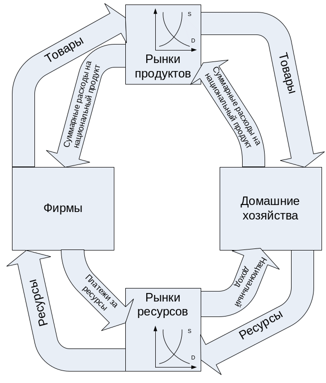 В рыночной системе на стадии возникновения, когда возник рынок и в стадии становления, когда появилась собственно рыночная экономика, присутствовали только два сектора экономики - домашние хозяйства и фирмы. Домашние хозяйства обладают рядом ресурсов производства: рабочей силой, капиталом и землей. Фирмы используют эти ресурсы в виде факторов производства товаров и услуг. Затем домашние хозяйства покупают произведенные товары и услуги. А для того, чтобы купить люди поставляют в производство ресурсы. Таким образом, возникает кругооборот товаров, услуг, денег и ресурсов в экономике, называемый экономическим кругооборотом.