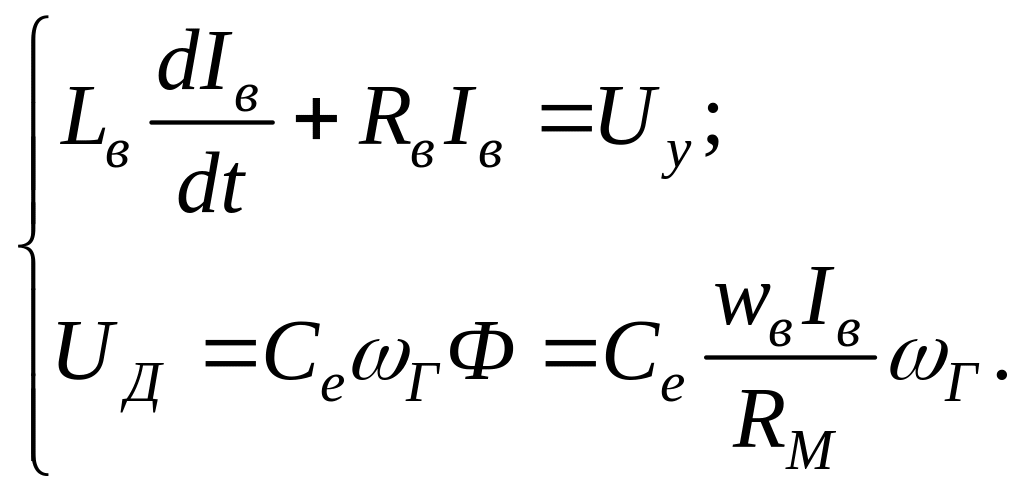 где k1 – коэффициент генератора; Т1 – постоянная времени генератора; Lв и Rв – индуктивность и сопротивления обмотки возбуждения генератора; RМ – магнитное сопротивления обмотки возбуждения генератора; Се – электрическая постоянная генератора; ωГ – угловая скорость вращения якоря генератора; wв – число витков обмотки возбуждения генератора; Ф – магнитный поток, наводимый в обмотке возбуждения генератора; Iв – ток обмотки возбуждения генератора.