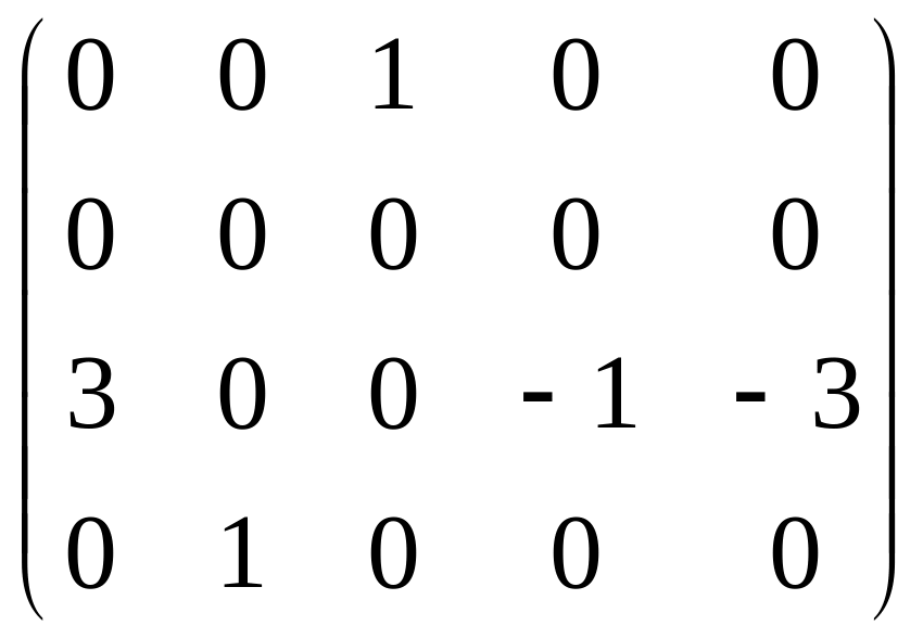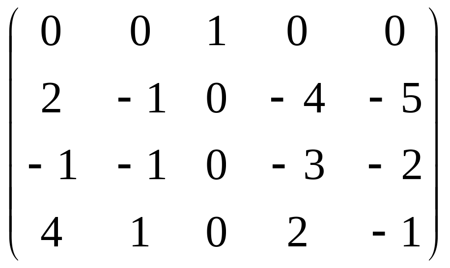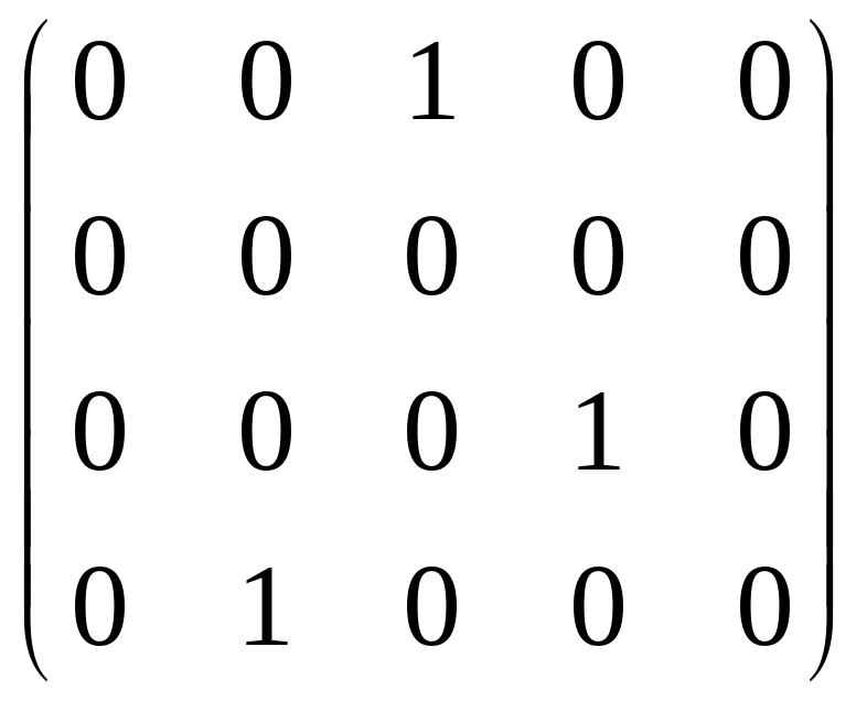 Тепер четвертий рядок останньої матриці додаємо до другого і третього, отримуючи при цьому ще два нулі в другому стовпчику, після чого робимо нулі в четвертому рядку всюди, крім одиниці на перетині четвертого рядка і другого стовпця. В результаті цих елементарних перетворень отримали: