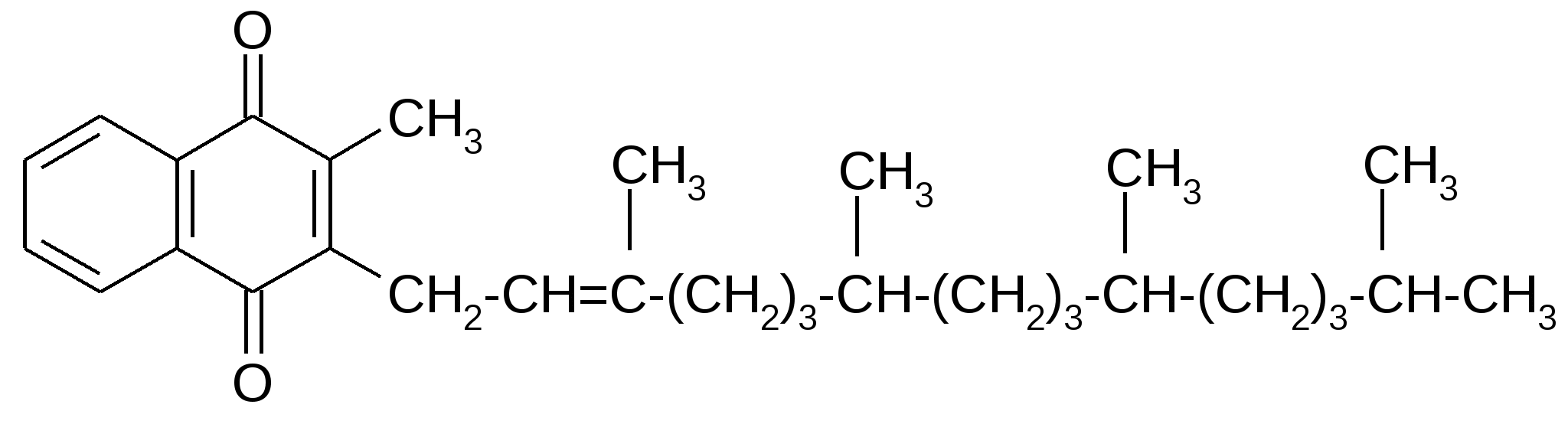 Витамины группы К - антигеморрагические факторы, необходимые для нормальной свертываемости крови. При недостатке витамина К биосинтез про тромбина и других компонентов тромбоцитов прекращается, капилляры лопаются и усиливается кровоточивость. По химической природе витамины К - производные 2 – метил -1,4- нафтохинона. У витамина К1 (филлохинона) в положении С3 стоит цепь фитола; у витамина К2 (менахинона) - цепь из 4-9 С-атомов. Филлохинон образуется в высших растениях (люцерне, шпинате, цветной капусте, хвое, томатах), менахинон - бактериями, в том числе живущими в ЖКТ. Синтетический аналог витамина К - викасол (1.5)[11,c.135]: