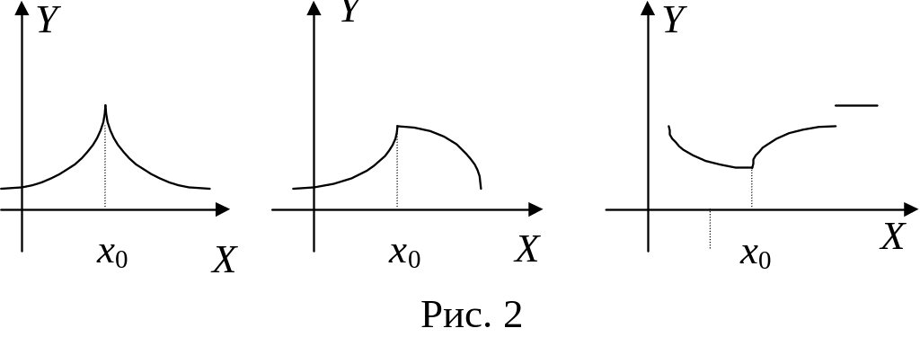 Производная функции f(x) не существует в тех точках, в которых функция не является непрерывной. В то же время функция может быть непрерывной в точке x0, но не иметь в этой точке производной. Такую точку назовём угловой точкой графика функции или точкой излома. Графические примеры приведены на рисунке 2.