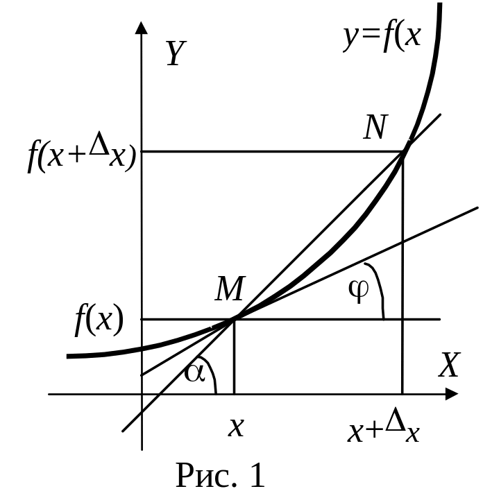 Отношение f /x, как видно из рисунка 1, равно тангенсу угла , который составляет секущая MN кривой y = f(x) c положительным направлением горизонтальной оси координат.