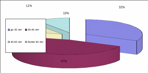 Анализируя возрастную структуру персонала можно сделать вывод, что в процессе планирования потребностей организации в рабочей силе стоит сделать упор на набор молодых сотрудников для передачи им опыта боле зрелыми работниками, так как велика доля сотрудников предпенсионного возраста.