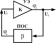 Тут бачимо якийсь трикутник і прямокутник. УЕ – цеусилительний елемент з коефіцієнтом передачі До, аПОС – це позитивний зворотний зв'язку з коефіцієнтом передачі. Коливання у цій системі виникнуть лише за дотримання дві умови. Таких дітей потрібно запам'ятати: