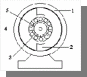 Индуктор складається з станини 1 циліндричною форми, виготовленої зферромагнитного матеріалу, і полюсів з обмоткою порушення 2, закріплених на станині.Обмотка порушення створює основний магнітний потік. Магнитний потік може створюватися постійними магнітами, укріпленими на станині.Якір складається з таких елементів: сердечника 3, обмотки 4, покладеної в пази сердечника, колектора 5.Сердечник якоря зменшення втрат на вихрові точки набирається з ізольованих друг від друга аркушів електротехнічній стали.