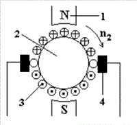 Розглянемо роботу машини постійного струму на моделі рис. 11.2, де1 – полюси індуктора, 2 – якір, 3 – провідники, 4 – контактні щітки.